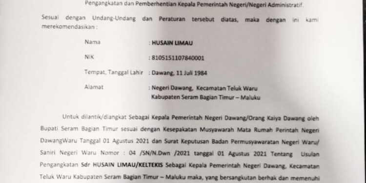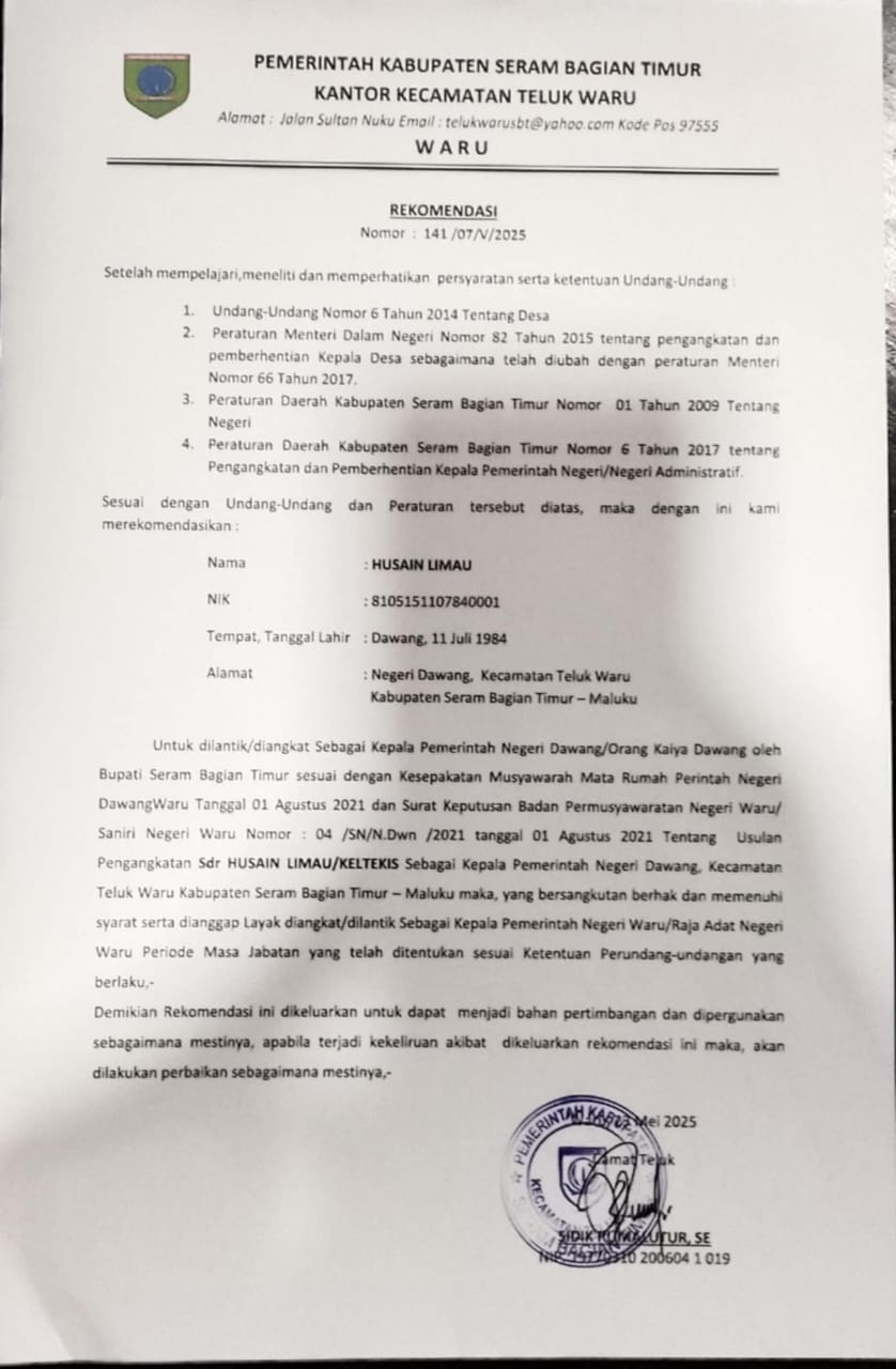 Dalam rekomendasi yang ditekan Camat Teluk Waru itu, direkomendasikan Husain Limau untuk dilantik dan disahkan oleh Bupati Seram Bagian Timur sebagai Kepala Pemerintah Negeri Dawang.