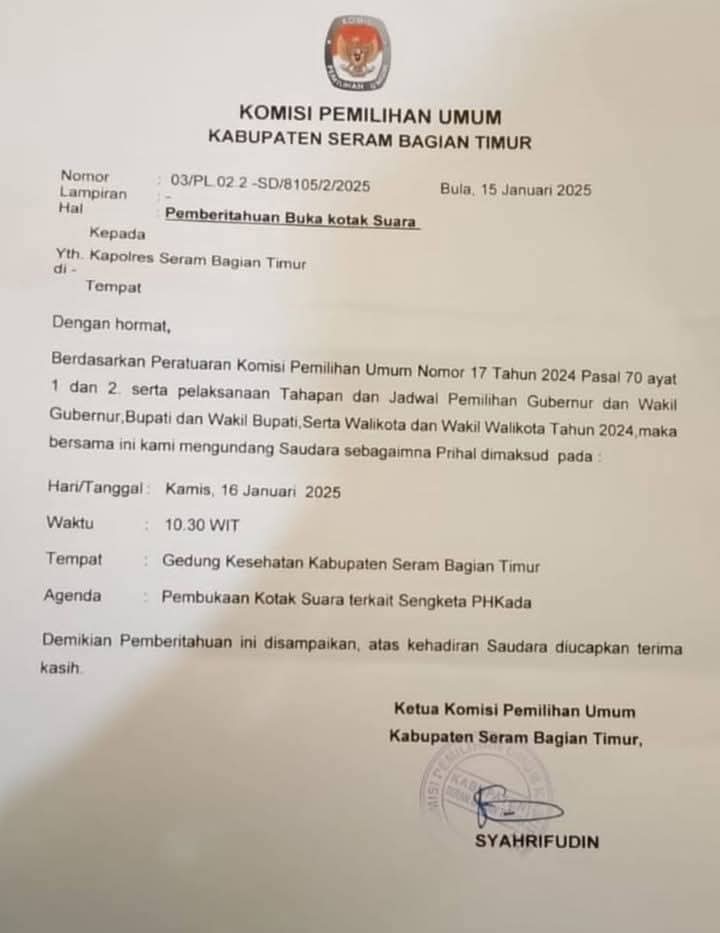 Untuk diketahui, beberapa hari terakhir ini jagat sosial media di Kabupaten Seram Bagian Timur (SBT) dibuat heboh dengan beredarnya sebuah surat dari KPUD yang ditujukan ke Polres, perihal pemberitahuan pembukaan Kotak Suara.