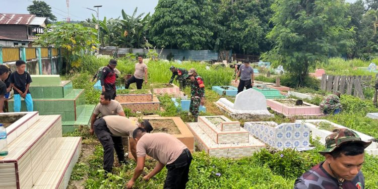 Saidobonews.com, Bula : Personil TNI dan Polri bersama warga di kota Bula kabupaten Seram Bagian Timur (SBT) menggelar bakti sosial, bersih-bersih lingkungan. Kegiatan ini difokuskan di Tempat Pemakaman Umum (TPU) Pantai Pos Kota Bula, Jum’at (27/12/2024).
